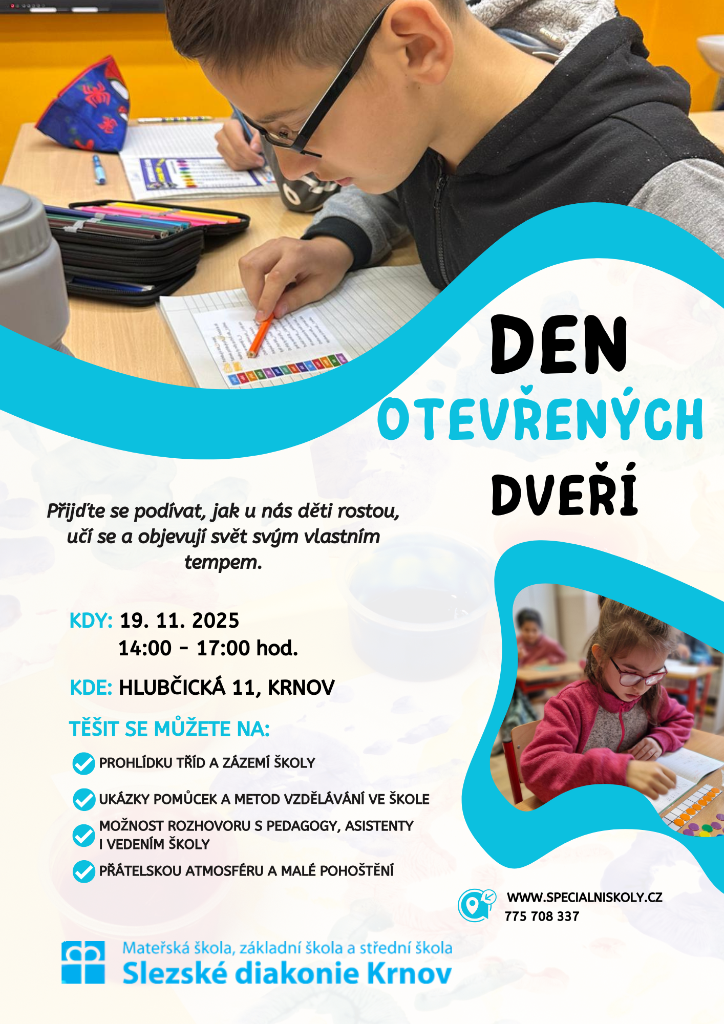 V jednotlivých třídách vás čekají ukázky výuky, speciálních pomůcek i aktivit, které podporují rozvoj každého žáka podle jeho možností a tempa.