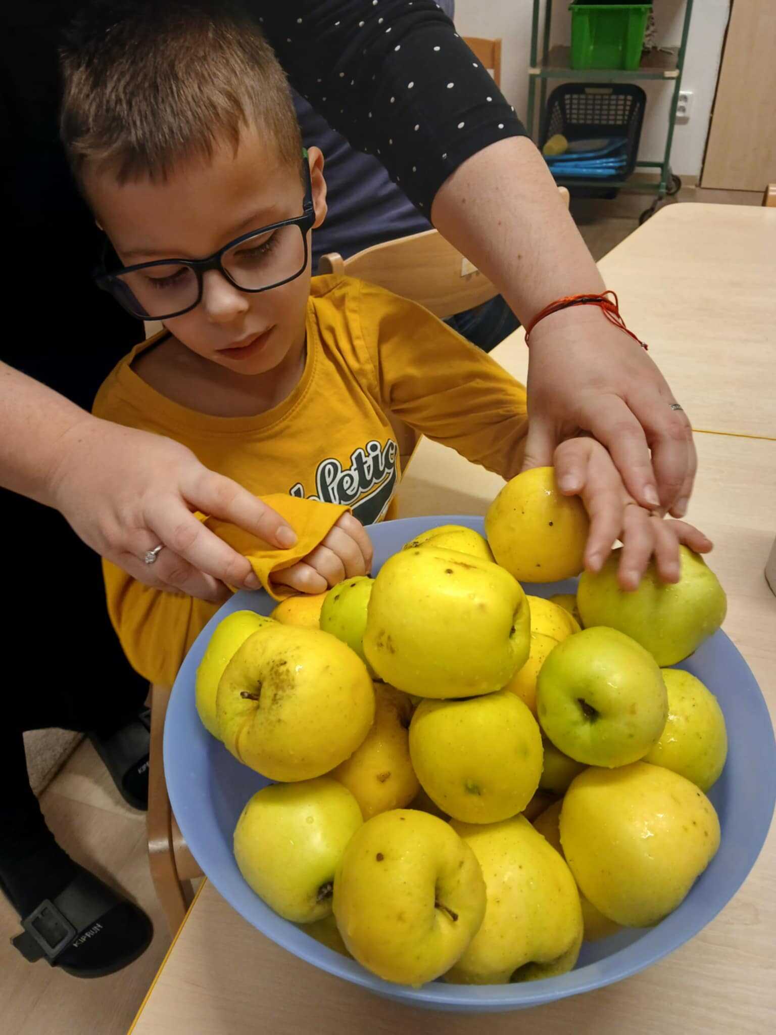 Myslíme i na podzimní potřebu vitamínů. Připravili jsme si jablíčka ze zahrádky, mrkev a citron. Všichni dali ruce k dílu, o to sladší byla odměna- slaďoučký mošt.