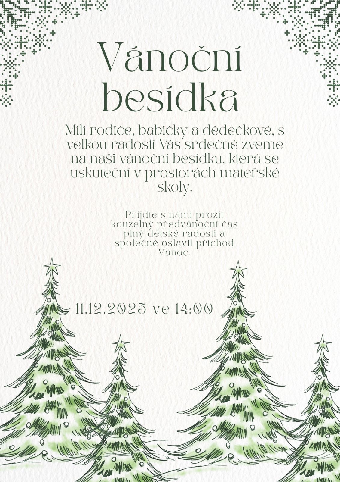 Srdečně zveme rodiče, prarodiče a přátele školy na Vánoční besídku, která se uskuteční 11. prosince 2025 od 14:00 v prostorách SPC, Nádražní 454/54, Krnov.